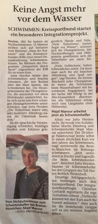 Eine besondere Erfolgsgeschichte ist die des Schwimmhelfers Mayd Mansur. Der 20-Jährige Palästinenser lernte selbst vor drei Jahren in einem ähnlichen Kurs das Schwimmen, nun unterstützt er, als Rettungsschwimmer mit Bronze-Abzeichen, Kinder und Jugendliche bei drei Schwimmgruppen des TuS Herten Bertlich-Westerholt.