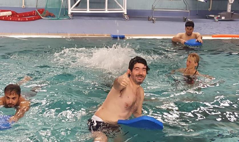 Zweimal pro Woche übten sie, gemeinsam mit Übungsleiterin Jutta Heyden, Schwimmhelfer Majd Mansur und Sozialarbeiter Martin Dienberg, im Lehrschwimmbecken der Christy-Brown-Schule. Mit großem Erfolg! Alle Teilnehmer der Abschlusseinheit stellten sich erfolgreich der abschließenden Aufgabe, eine Längsbahn des Lehrschwimmbeckens ohne Hilfsmittel zu überwinden.